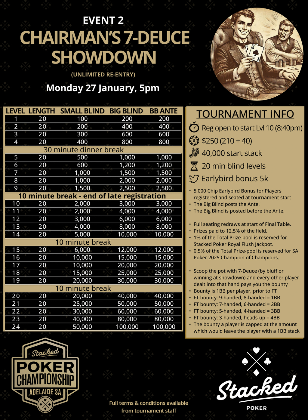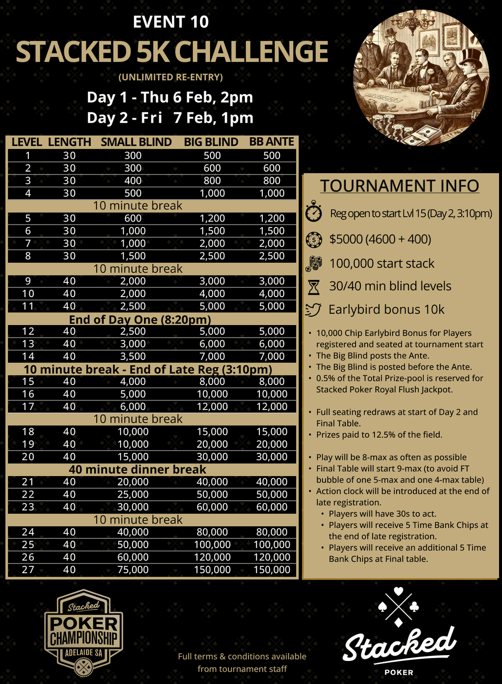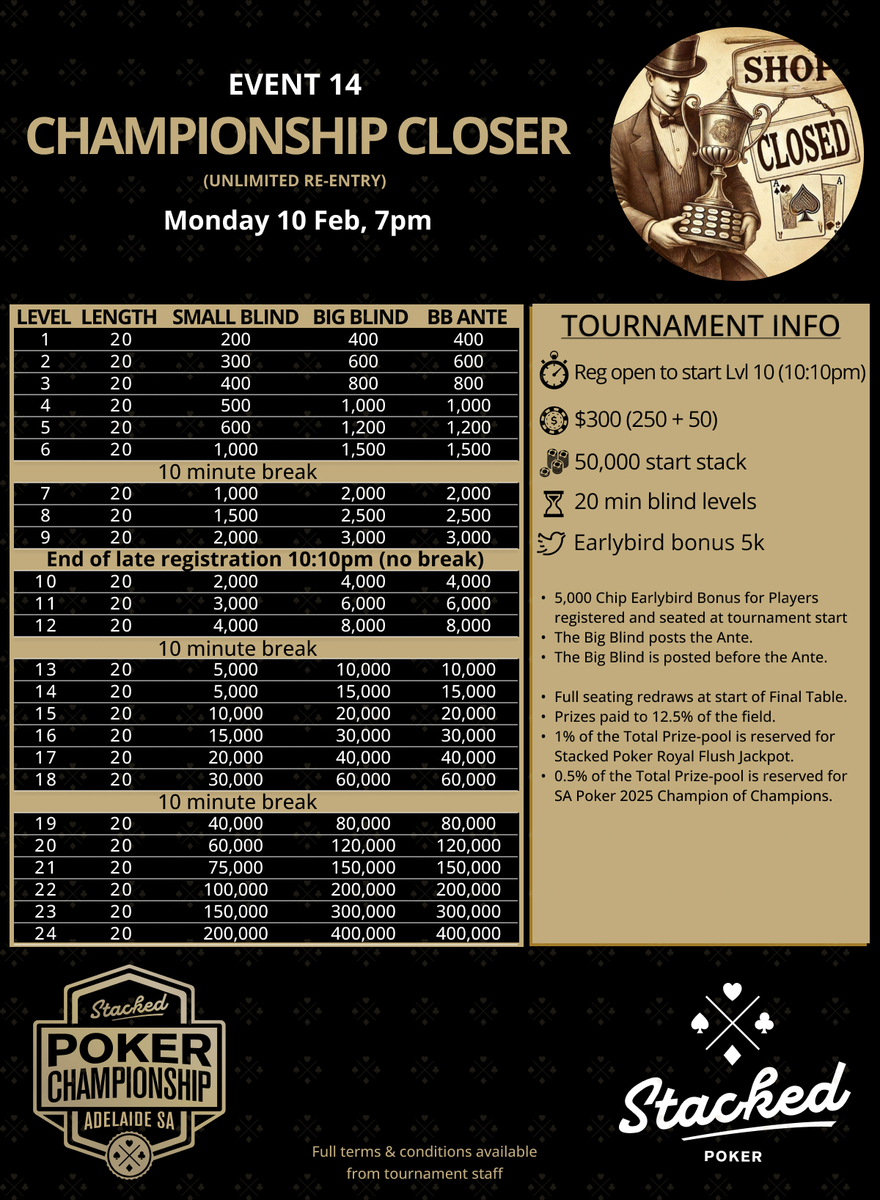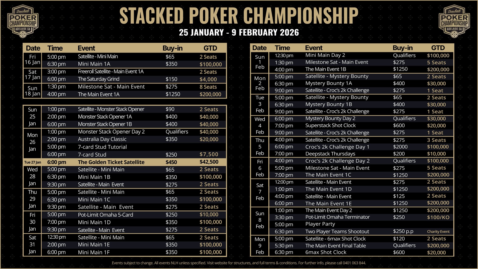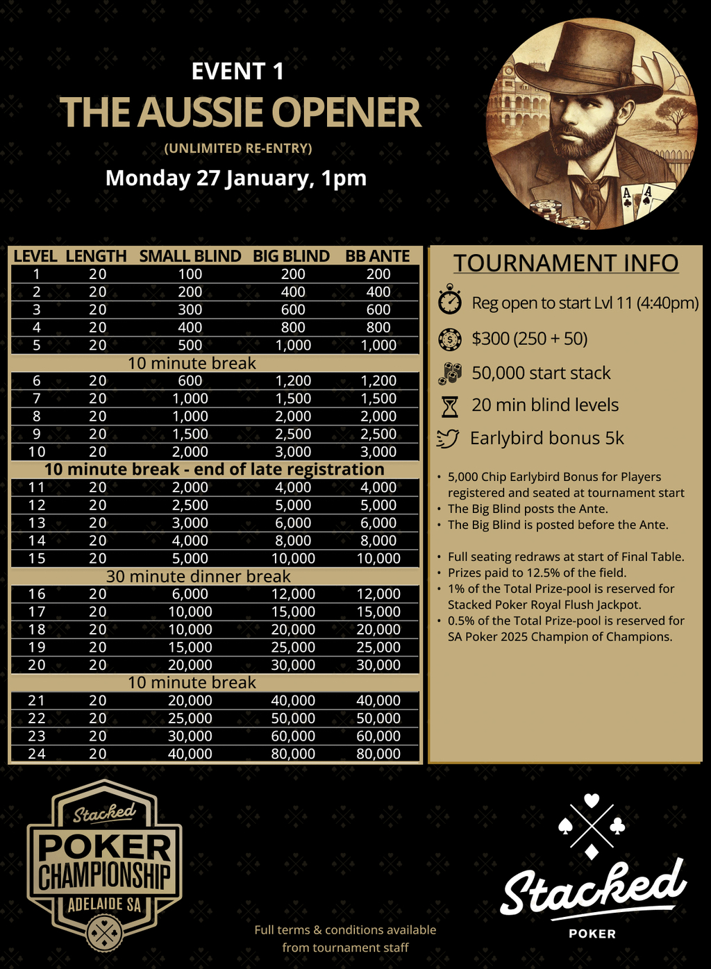 Mark your calendars for 16–29 October 2024 as the Stacked Poker Championship returns for 14 thrilling days of unforgettable gaming. Experience the excitement of the Aussie Opener, challenge yourself in the Stacked Staged Shootout, and showcase your strategy in the Chairman’s 7-Deuce Showdown and Survivor Bounty. Don’t miss out on this highly anticipated event!