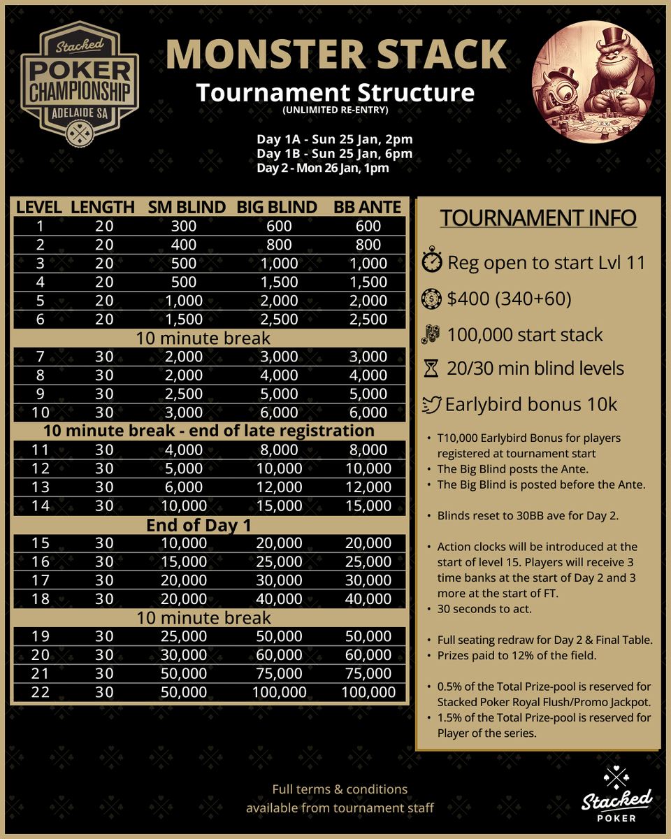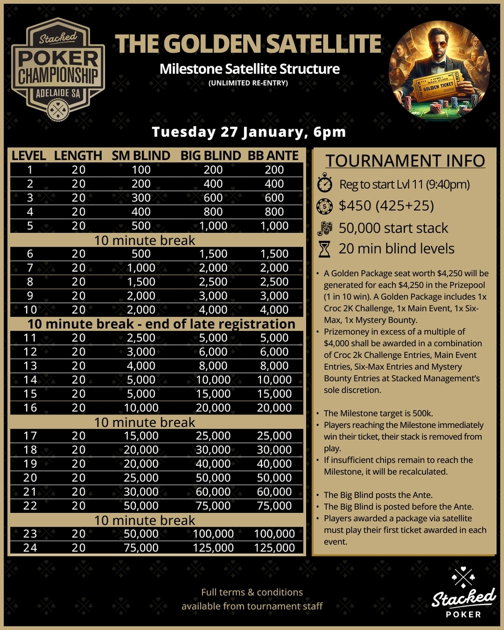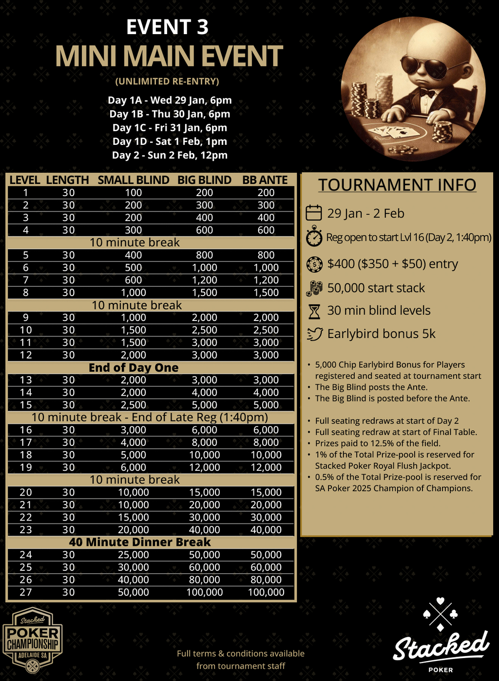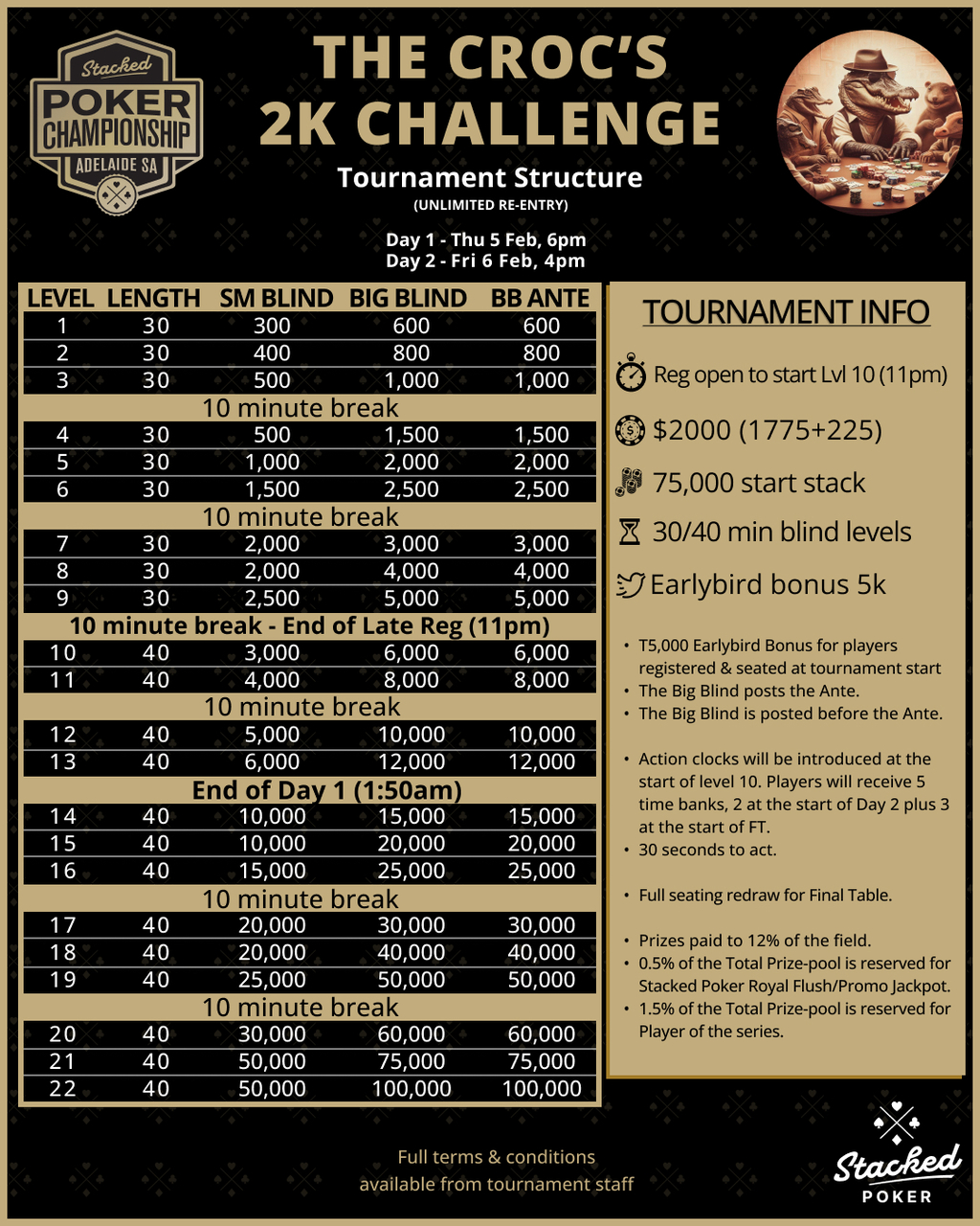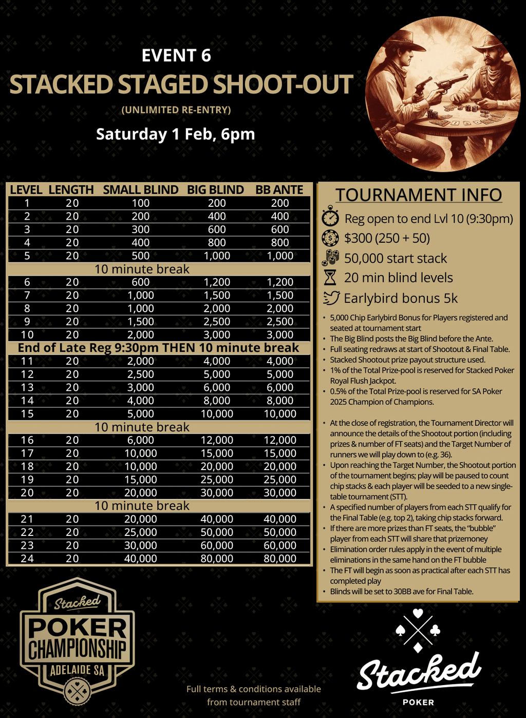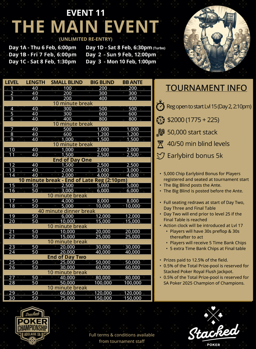 Mark your calendars for 16–29 October 2024 as the Stacked Poker Championship returns for 14 thrilling days of unforgettable gaming. Experience the excitement of the Aussie Opener, challenge yourself in the Stacked Staged Shootout, and showcase your strategy in the Chairman’s 7-Deuce Showdown and Survivor Bounty. Don’t miss out on this highly anticipated event!