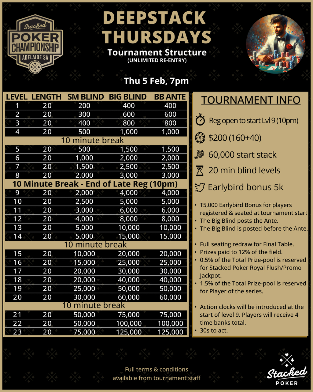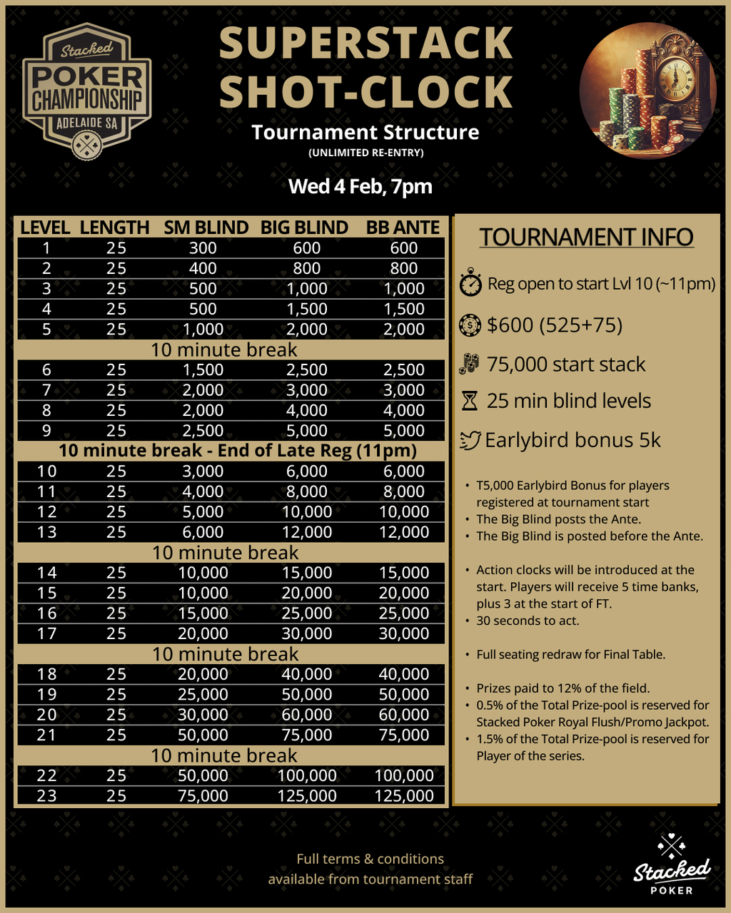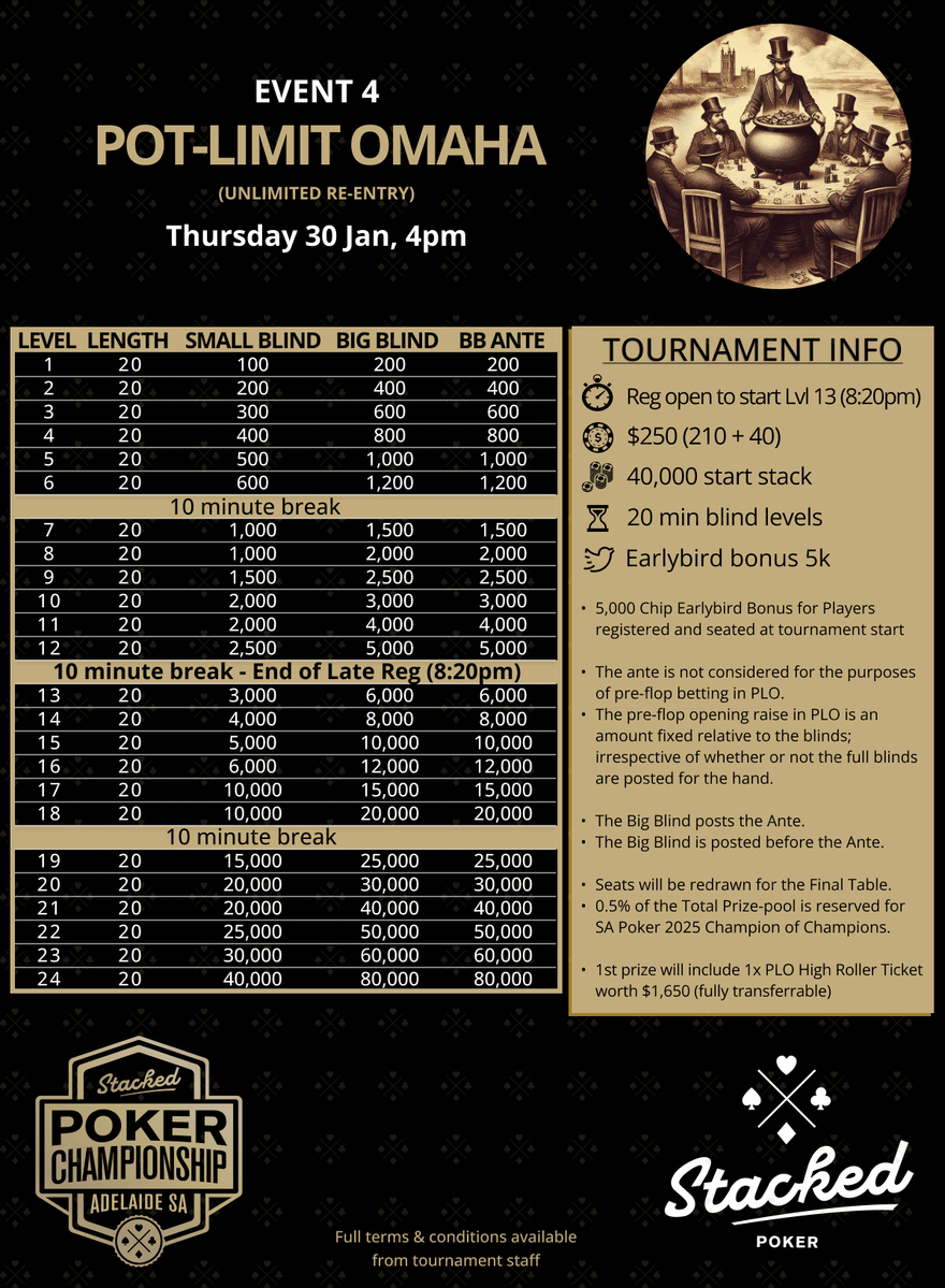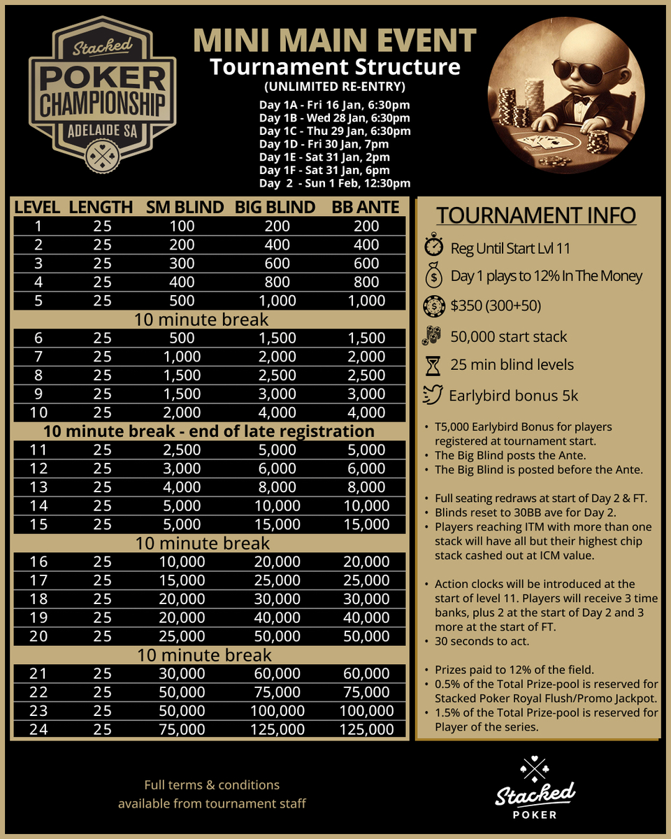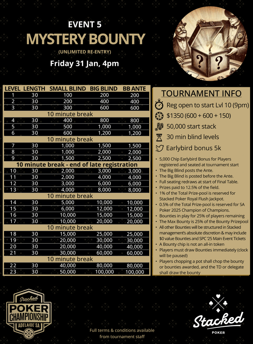 Mark your calendars for 16–29 October 2024 as the Stacked Poker Championship returns for 14 thrilling days of unforgettable gaming. Experience the excitement of the Aussie Opener, challenge yourself in the Stacked Staged Shootout, and showcase your strategy in the Chairman’s 7-Deuce Showdown and Survivor Bounty. Don’t miss out on this highly anticipated event!