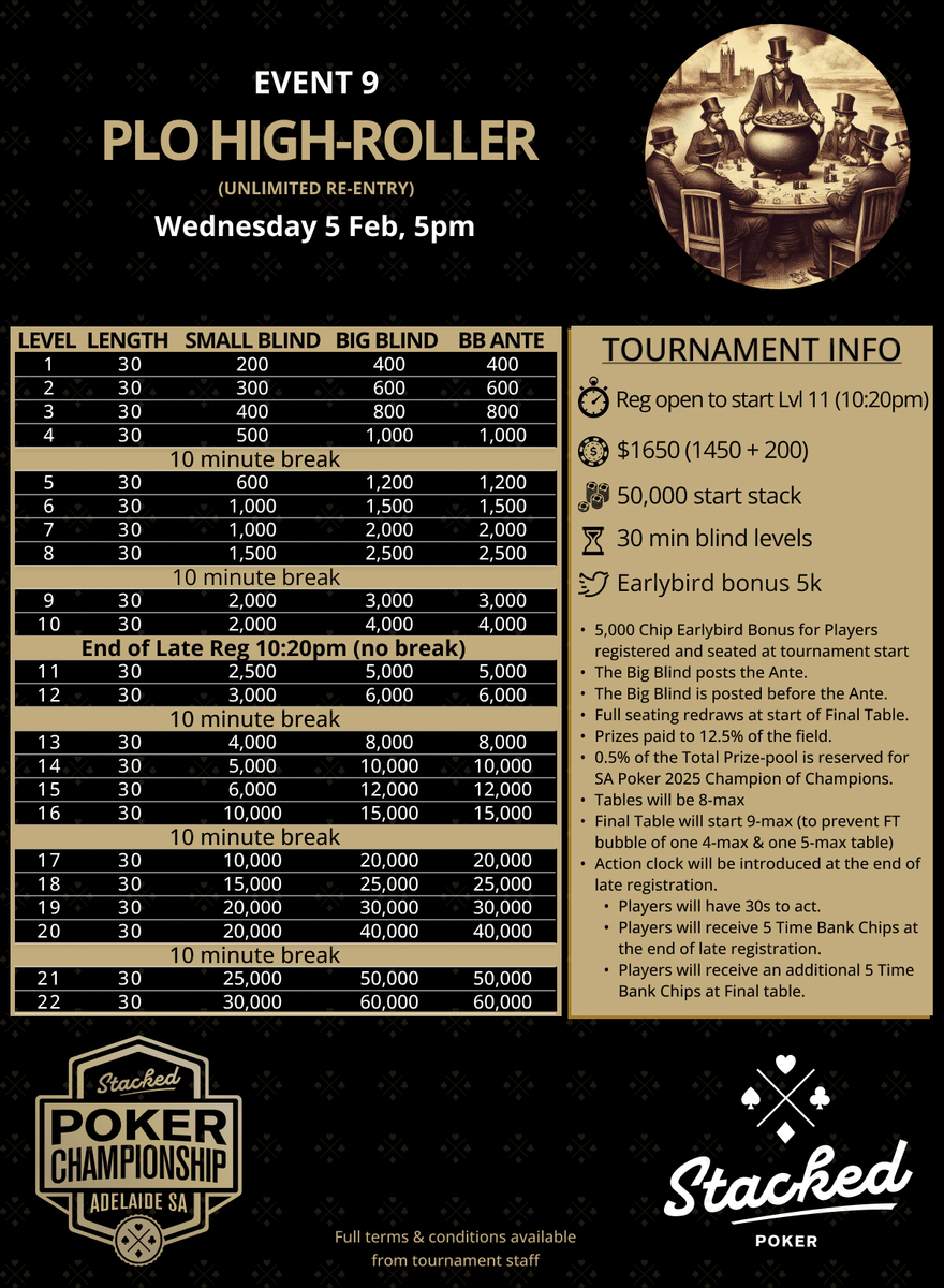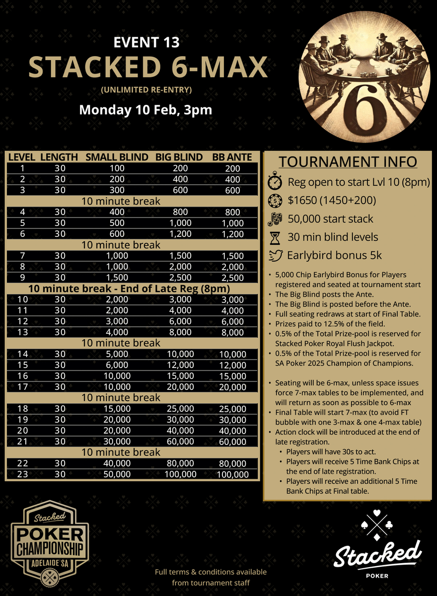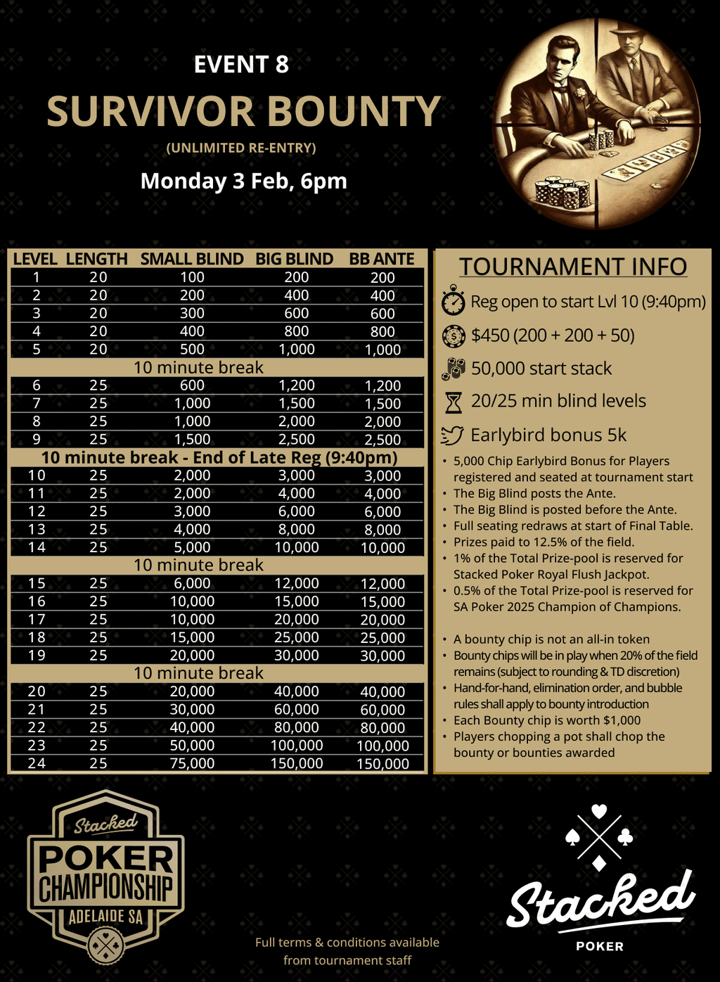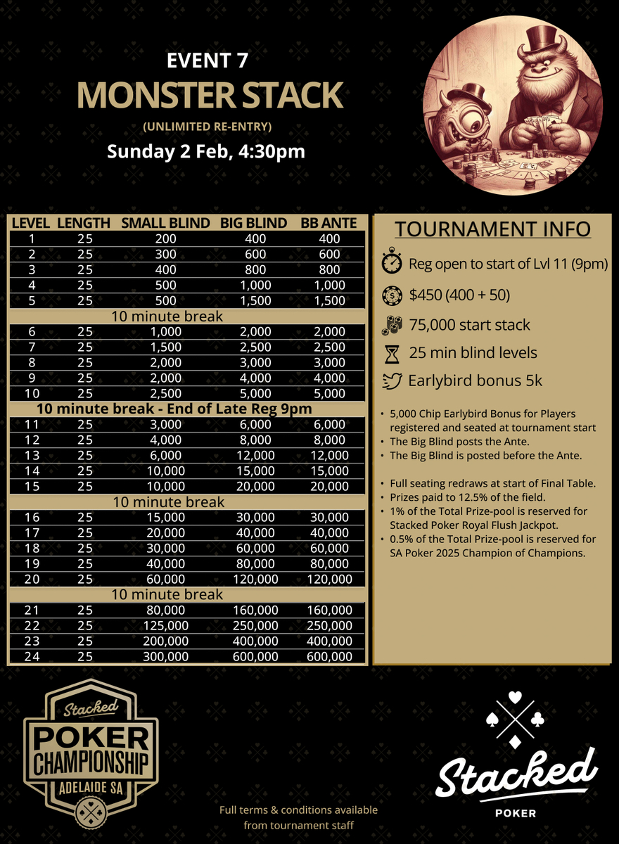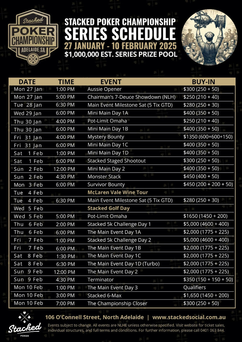 Mark your calendars for 16–29 October 2024 as the Stacked Poker Championship returns for 14 thrilling days of unforgettable gaming. Experience the excitement of the Aussie Opener, challenge yourself in the Stacked Staged Shootout, and showcase your strategy in the Chairman’s 7-Deuce Showdown and Survivor Bounty. Don’t miss out on this highly anticipated event!